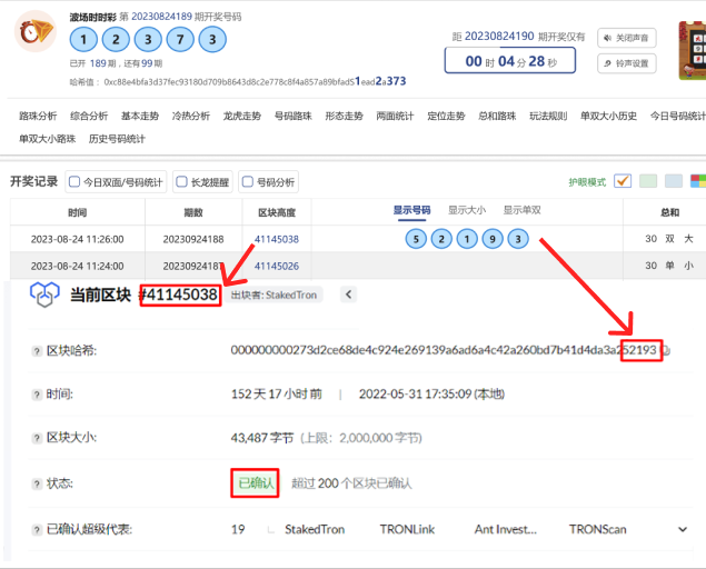 开奖号码依据 https://tronscan.org/ 里的区块高度>哈希值而计算出来。