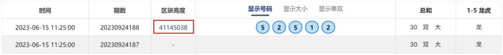 在下一个开奖时间后,最快收到的特定区块高度,将使用它的哈希值作为开奖结果。